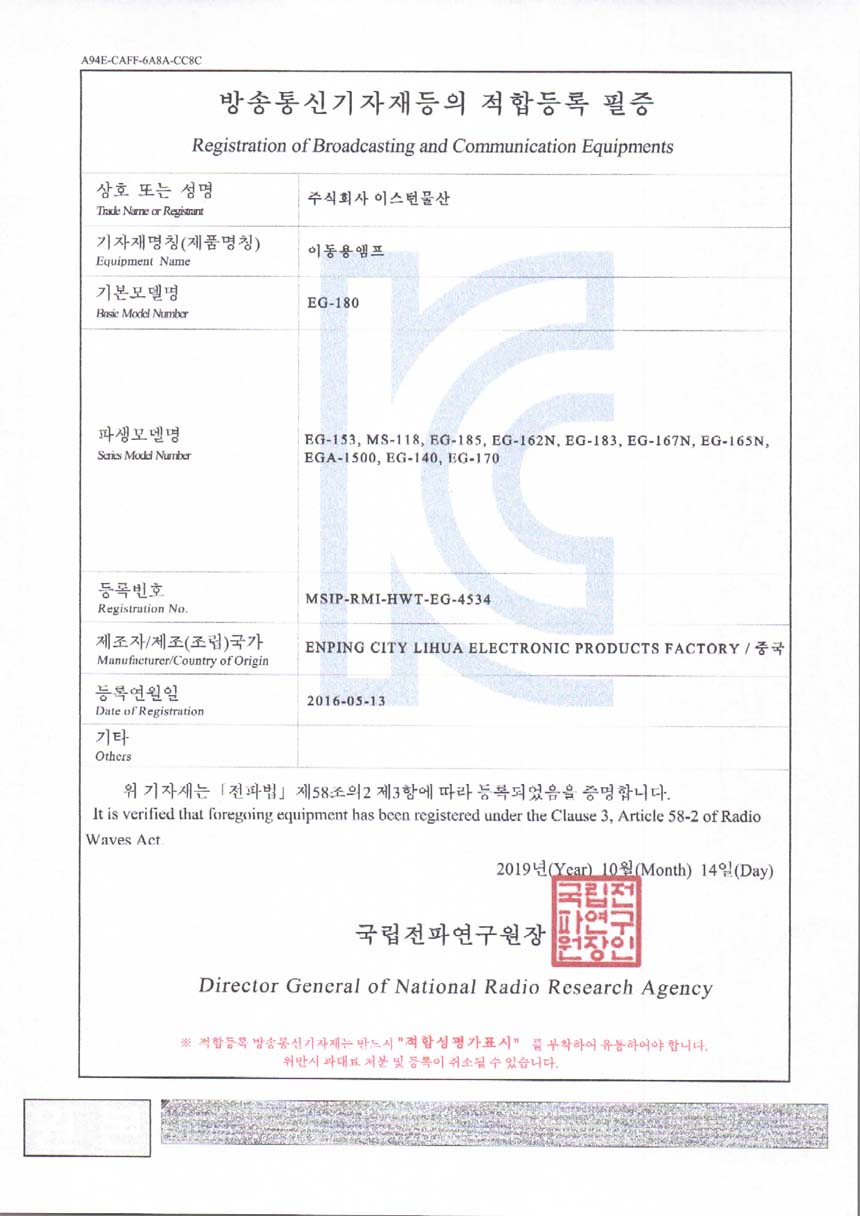 - 방송 통신 지자재 적합 인증 번호 : MSIP-REI-HWT-EG-4534 / MSIP-CRI-HWT-HT-600 / MSIP-CRI-HWT-PT-600