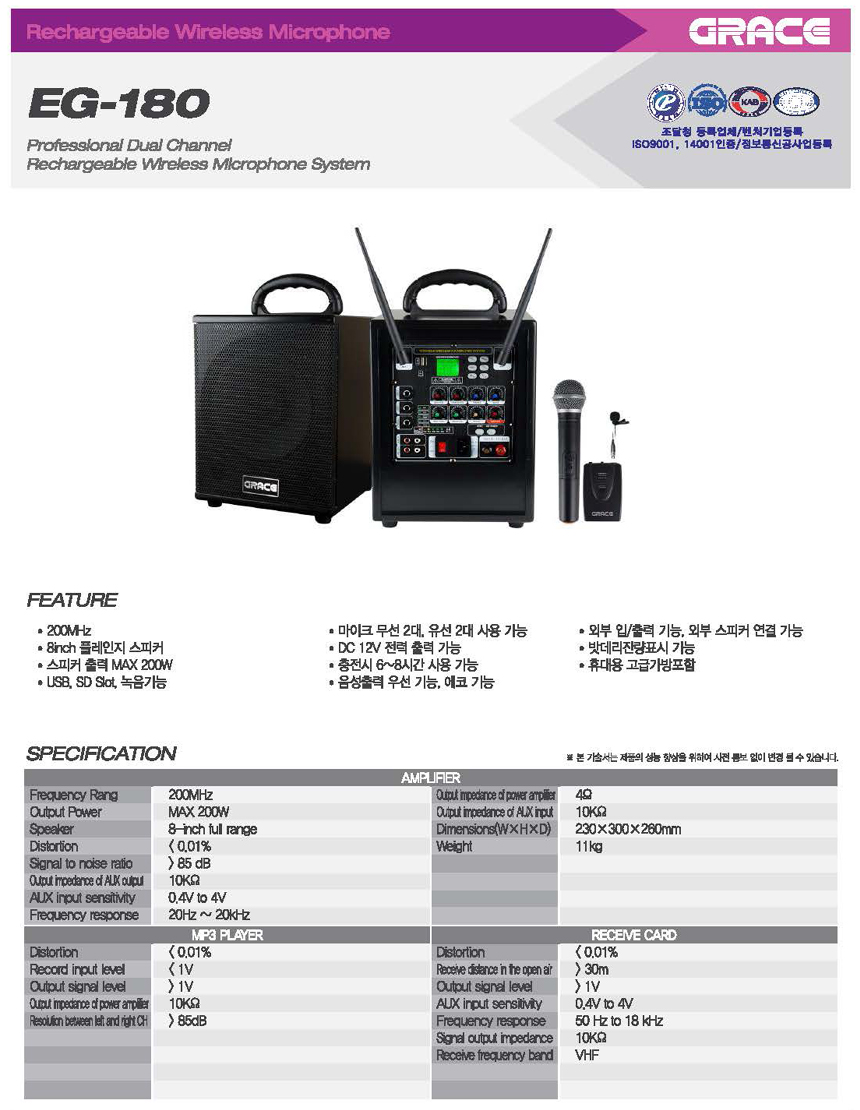 - 품 명 : 카날스 충전 이동식 앰프 200W / EG180