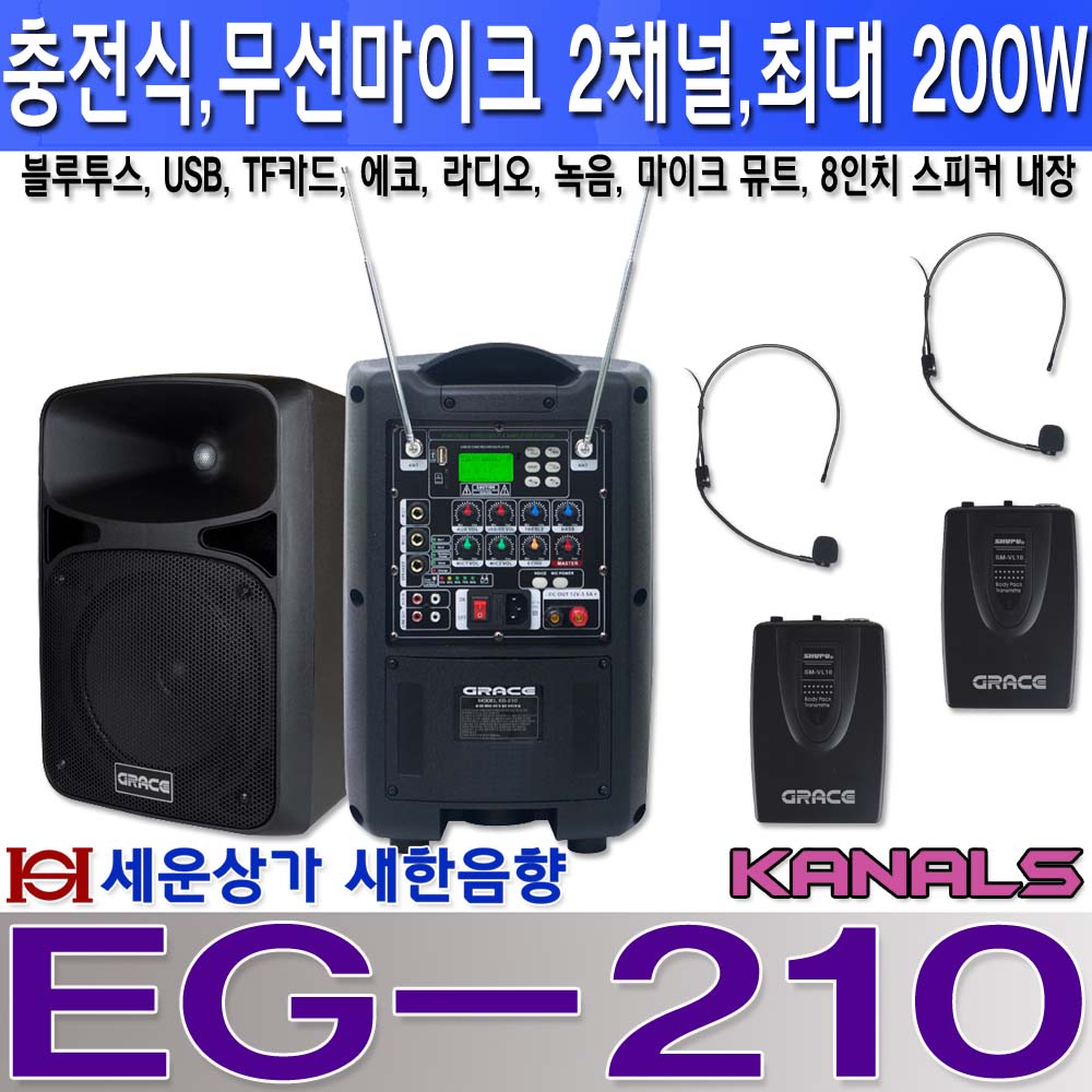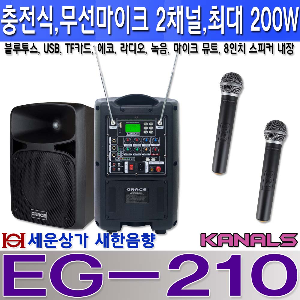 EG-210 카날스 충전식 앰프 200W, 2채널 무선 마이크, 블루투스, USB, TF CARD, 라디오, 에코, 녹음, 뮤트/ EG210 / 버스킹, 안전 교육, 전시장, 실내 외 행사, 강당, 교회, 체육관, 휘트니스, 헬스장 등