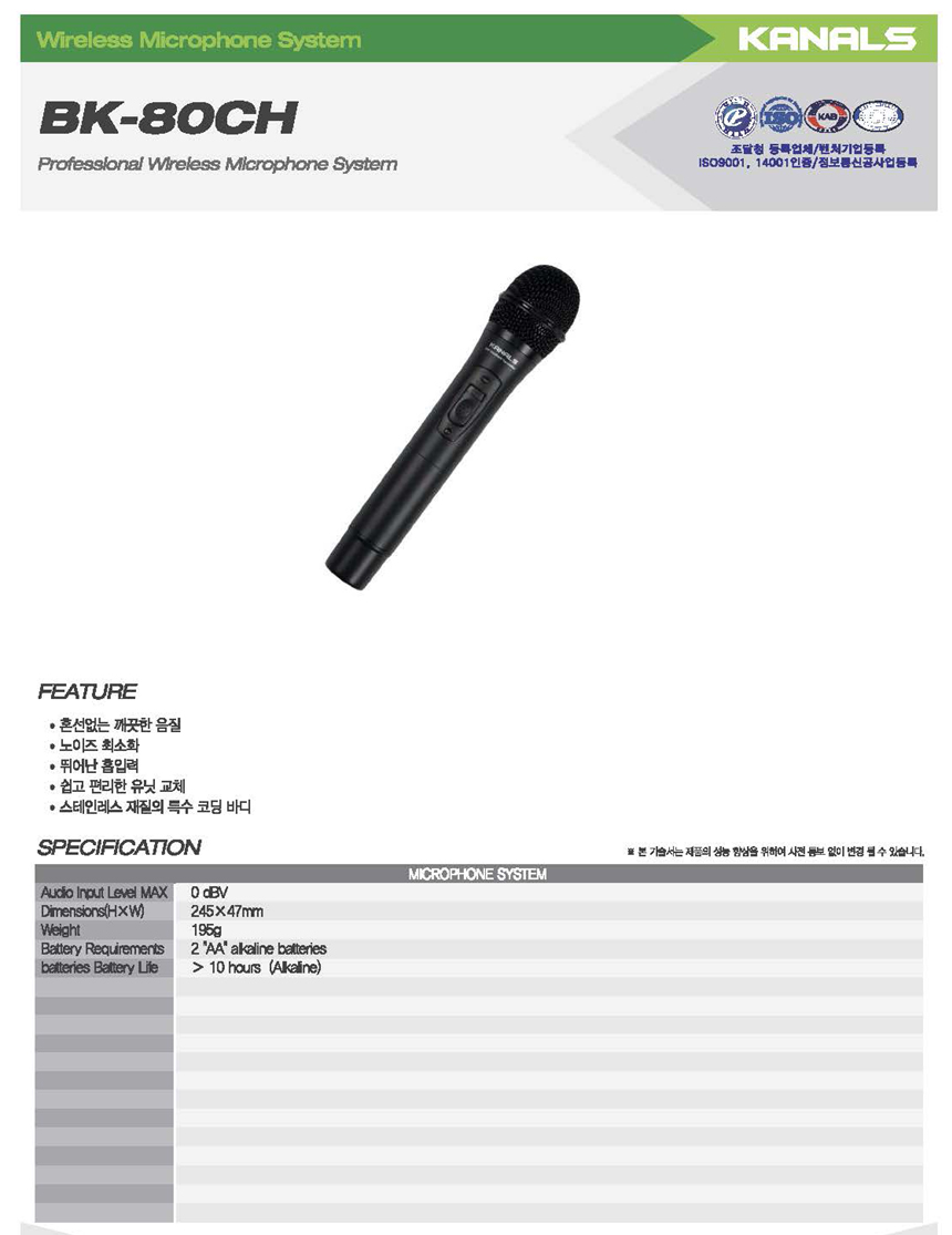 - 무선 마이크 송신기 모델명 : BK-80CH, BK-80CB, AL-95H