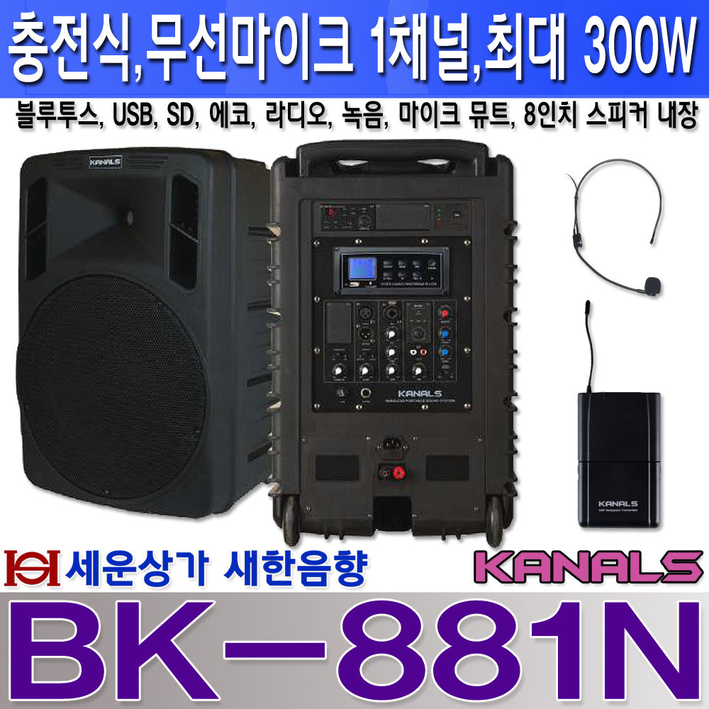 BK-881N카날스 충전식 앰프 300W, 1채널 무선 마이크,블루투스,USB,에코 녹음 : 세운상가 새한음향