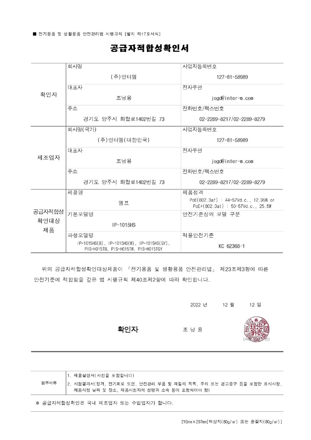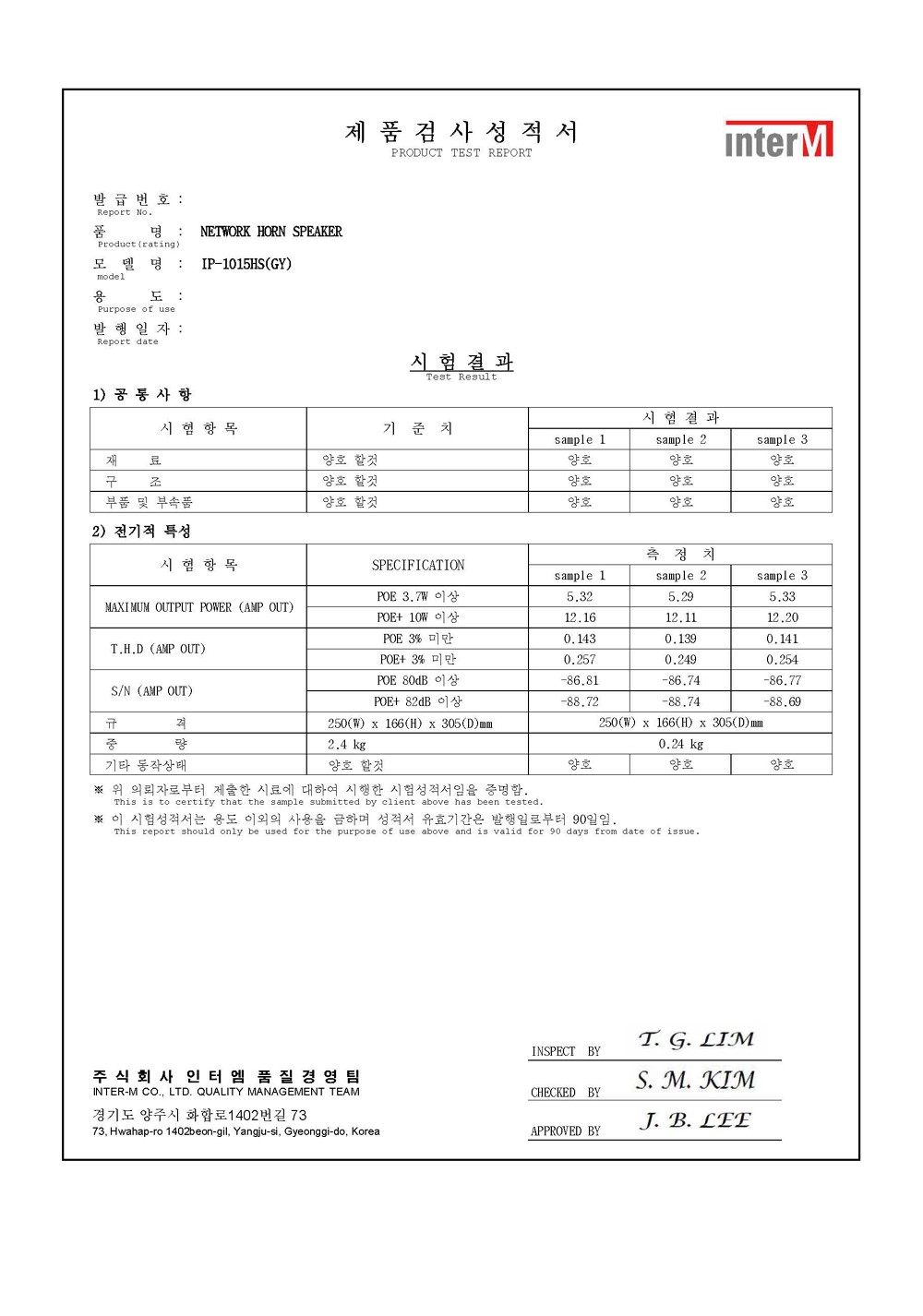 - 방송 통신 기자재 적합 인증 : R-R-IMK-IP-1015HS