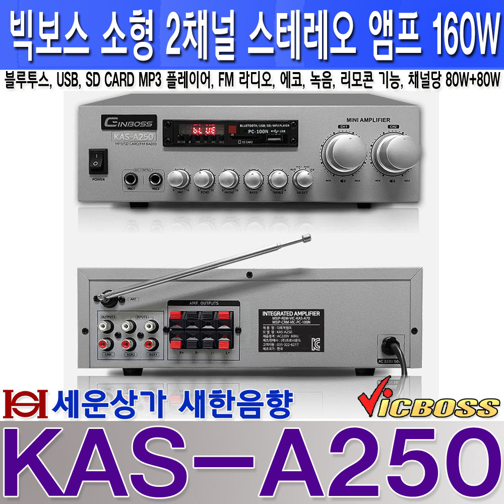KAS-A250 빅보스 2채널 앰프 160W, USB 블루투스, SD 카드, 녹음, 에코, FM 라디오 기능, 마이크 입력 2개, 라인 입출력 단자 / KASA250