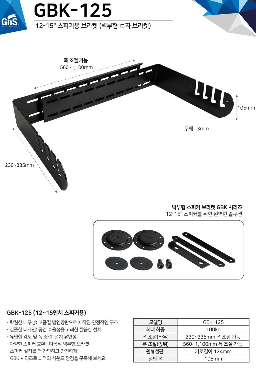 * 제품의 특징 및 사양 ( 지앤에스 벽부형 스피커 브라켓 GBK-125 )