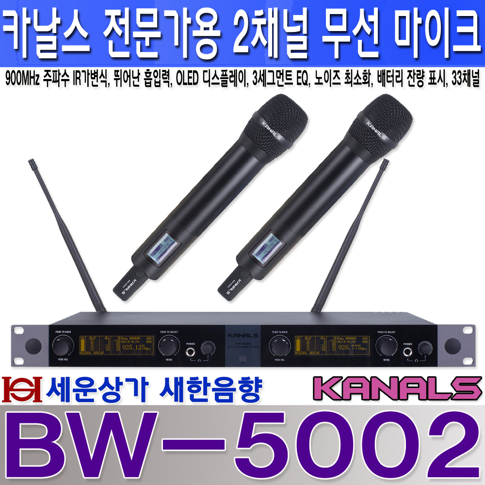 BW-5002 카날스 전문가용 2채널 무선 마이크, 900MHz 가변식, 무대 공연 ,버스킹, 강의, 행사등 고음질 최고의 흡입력 무선 마이크