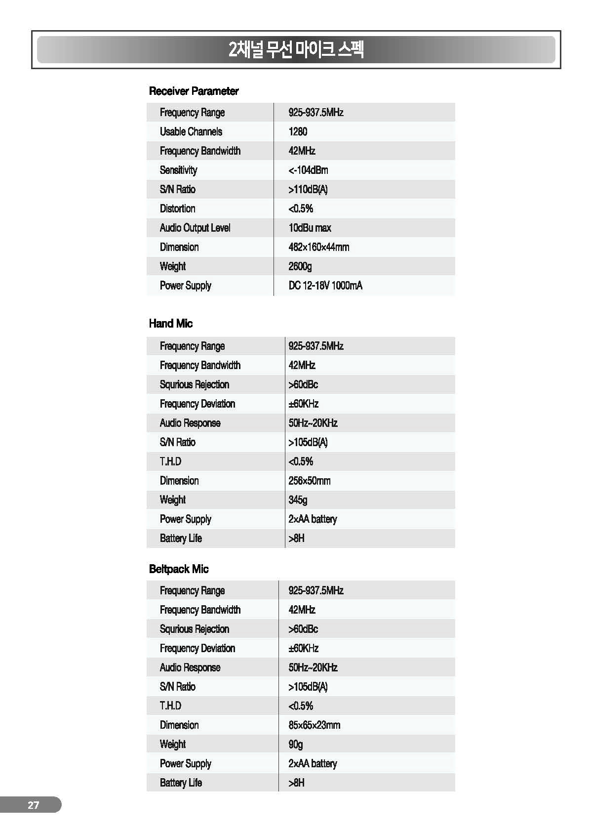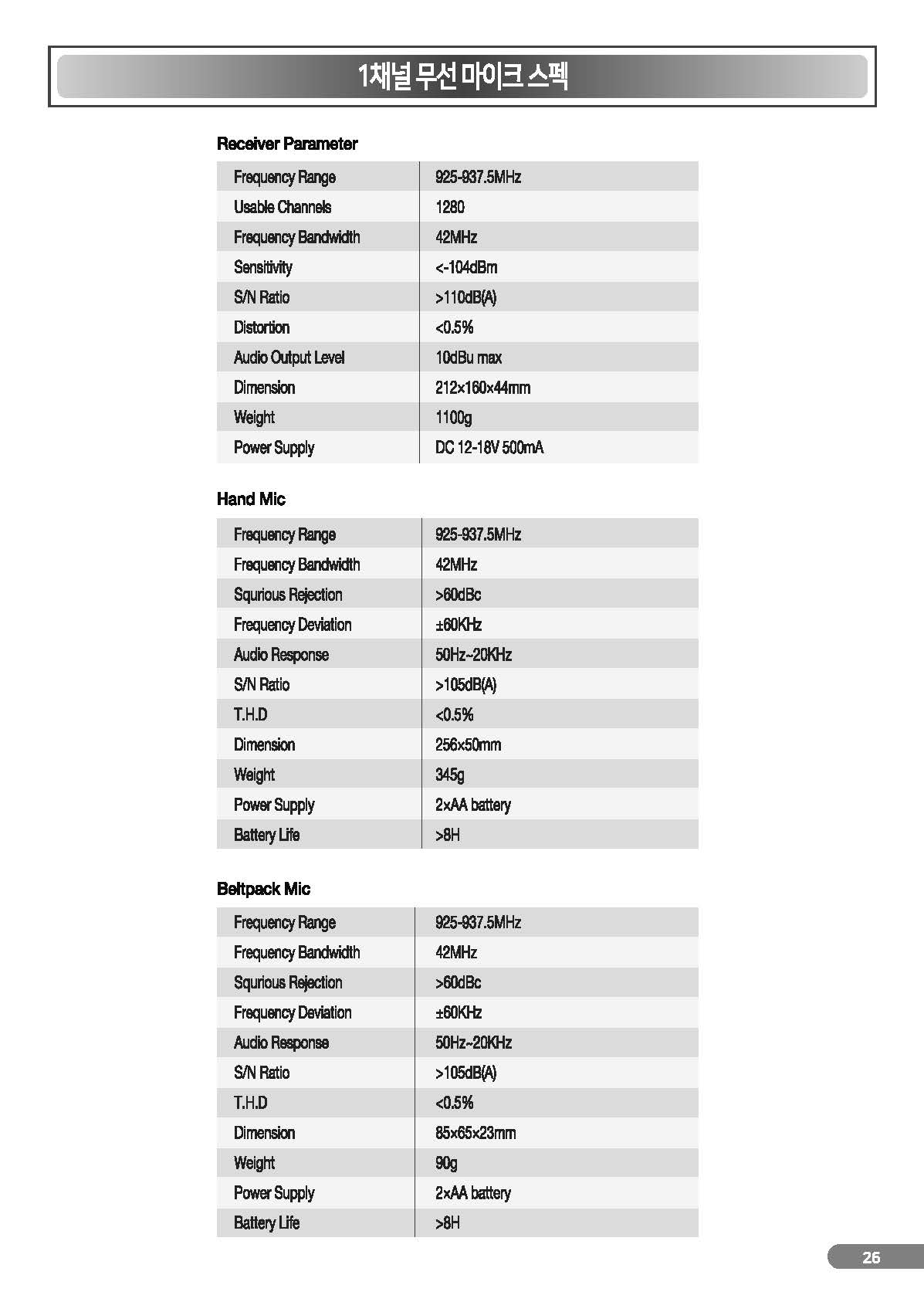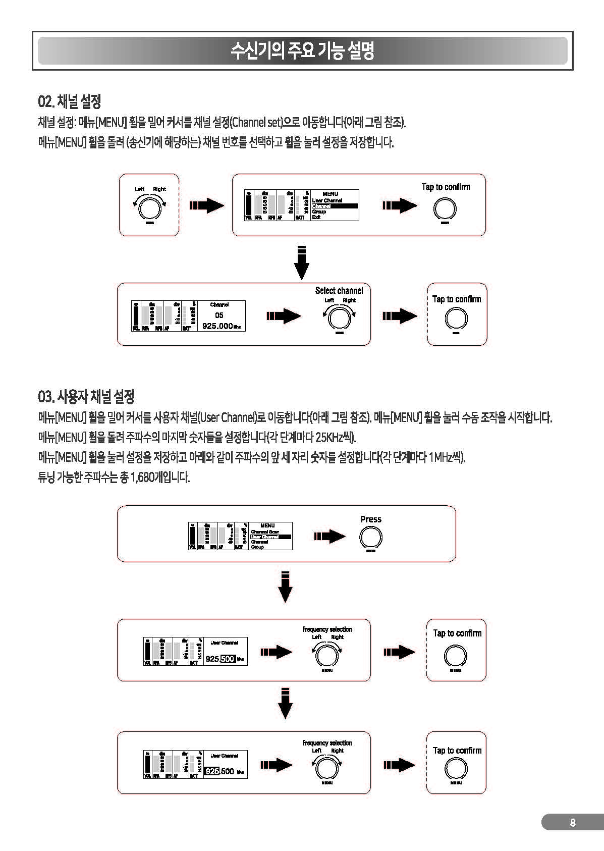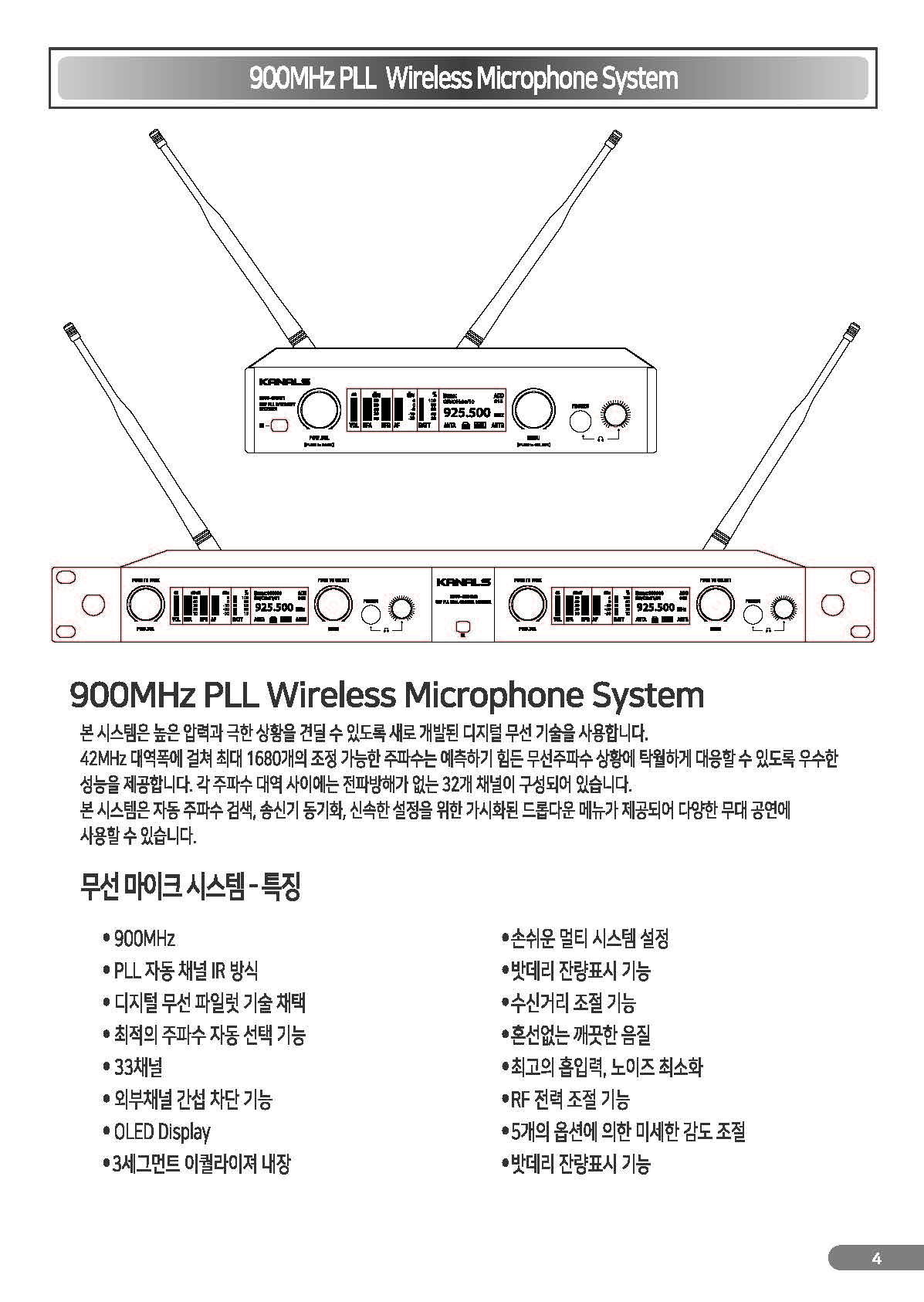 - PLL 자동 채널 설정 방식의 무선 수신기로 혼선 없는 맑고 깨끗한 음질을 보장하며,