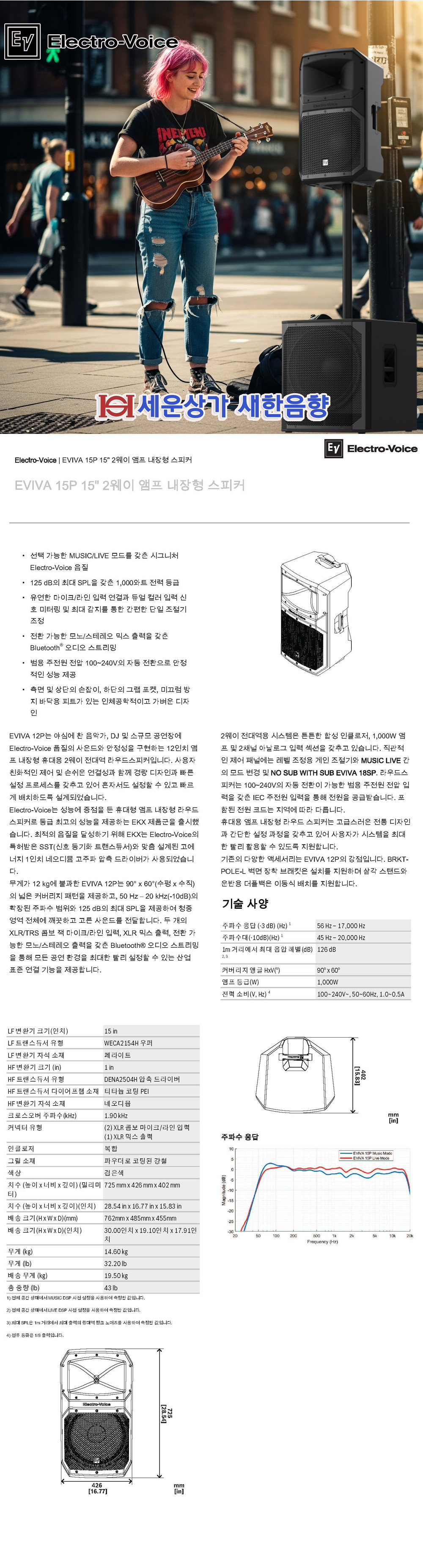 * 제품의 특징 및 사양 ( EV 일렉트로보이스 15" 앰프 내장 파워드 스피커 EVIVA15P / 에비바15P )
