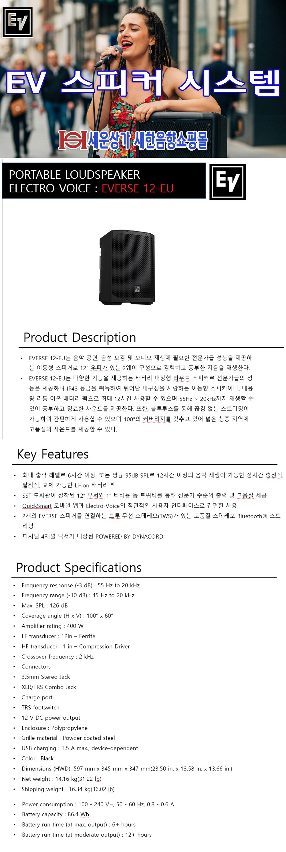 https://smartstore.naver.com/inkelsaehan/products/11948152247 EVERSE12 이브이 EV 충전식 파워드 스피커 400W, 앰프 내장형, 공연 연주 버스킹 등, 일렉트로보이스 에버스12