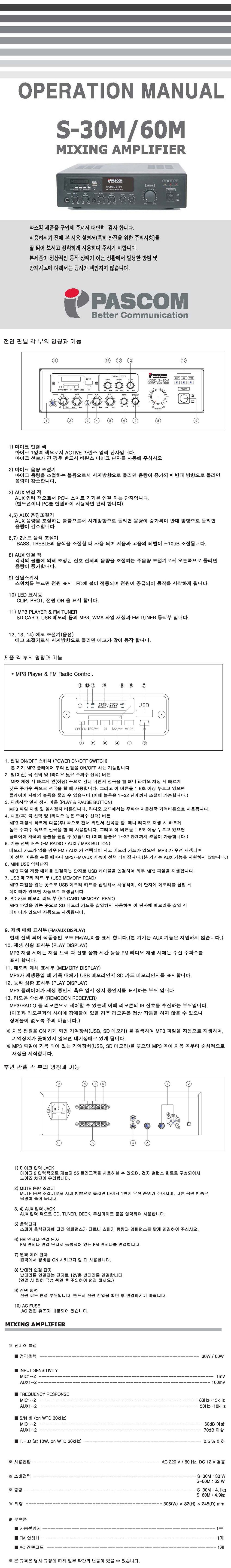 * 제품의 특징 및 사양 ( 파스컴 소형 믹싱 앰프 S-60M )