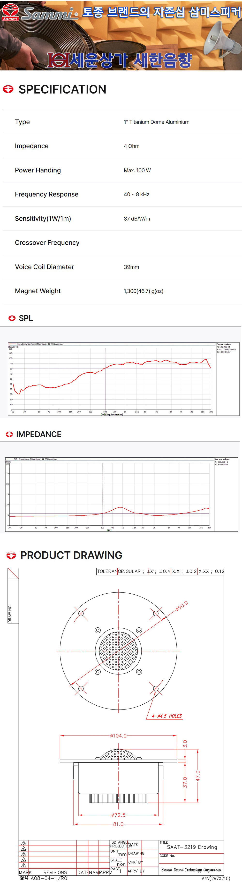* 제품의 특징 및 사양 ( 삼미스피커 카오디오 및 하이파이 오디오용 티타늄 고음 스피커 SAAT-3219 )