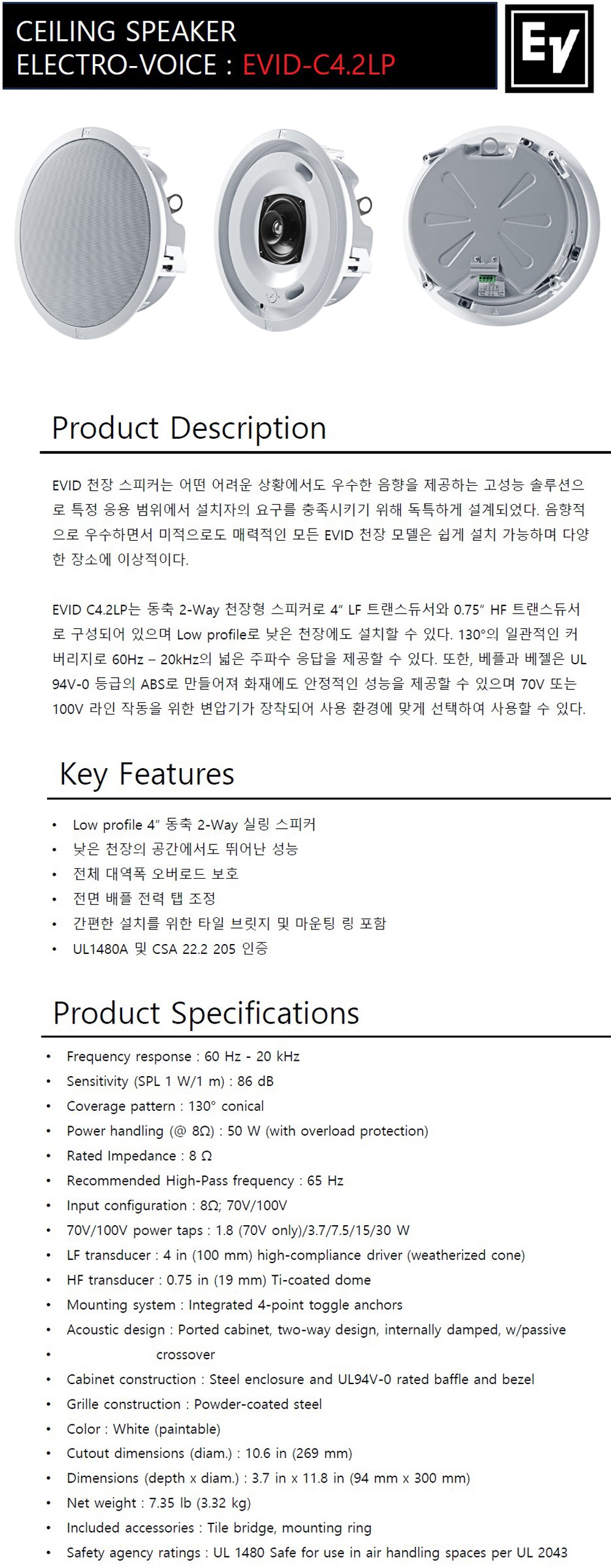 EVID-C4.2LP 이브이 EV 실링 스피커 50W,2웨이 방식,하이/로우임피던스 겸용, EVIDC4.2LP