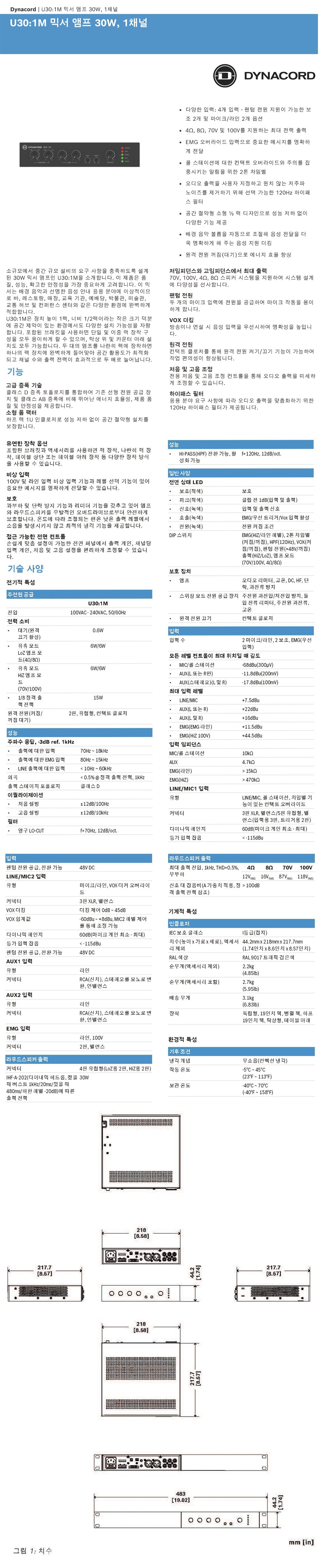 * 제품의 특징 및 사양 ( 일렉트로보이스 다이나코드 U30:1M – 30W 믹서 앰프 )