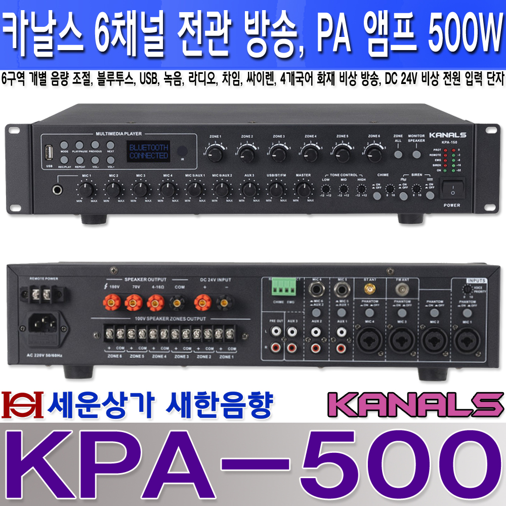 KPA-500 카날스 6채널 PA 앰프 500W, 블루투스 USB 녹음, 라디오, 6구역 개별 음량 조절, 화재 비상 방송, 24V 배터리 비상 배터리 입력, 리모트 전원 ON/OFF, 리모트 차임, KPA500