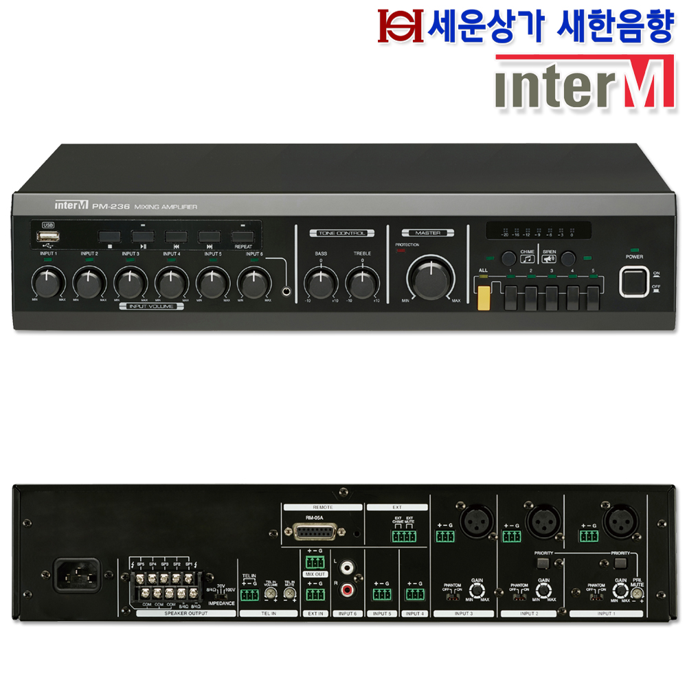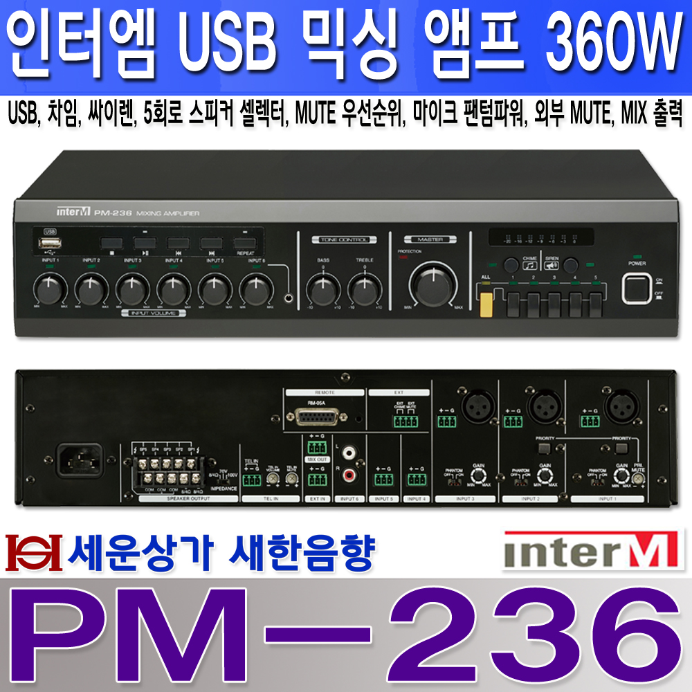 PM-236 인터엠 USB 믹싱 앰프 360W, 차임, 싸이렌 뮤트, 팬텀파워, 5셀렉터 : 새한음향 세운상가