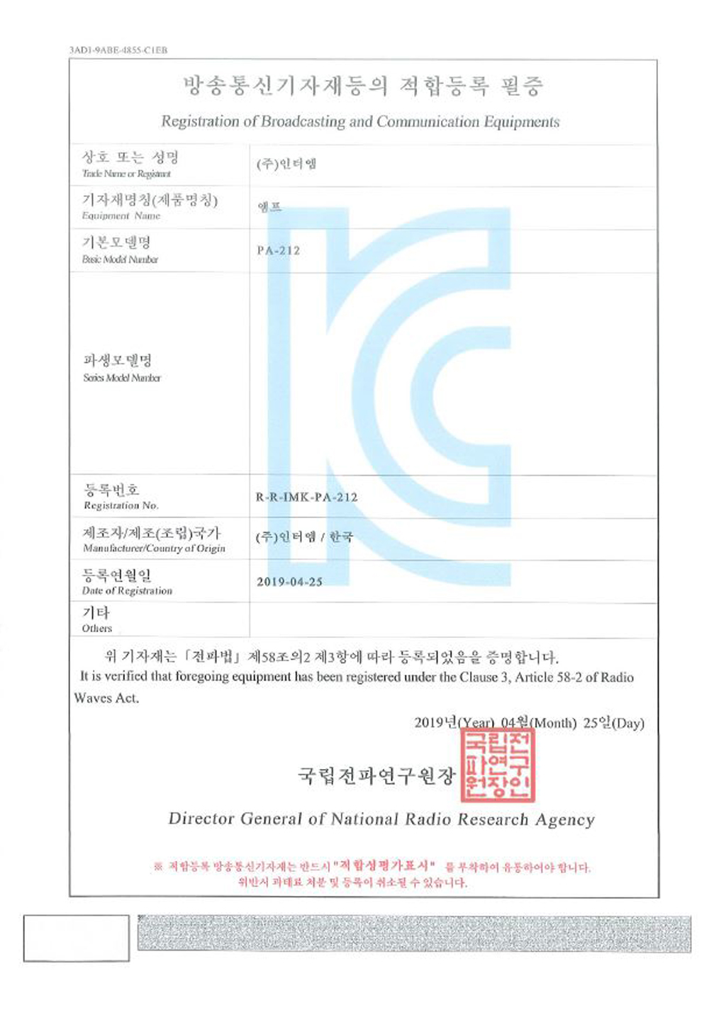 - 방송 통신 기자재 인증 번호 : R-R-IMK-PA-212