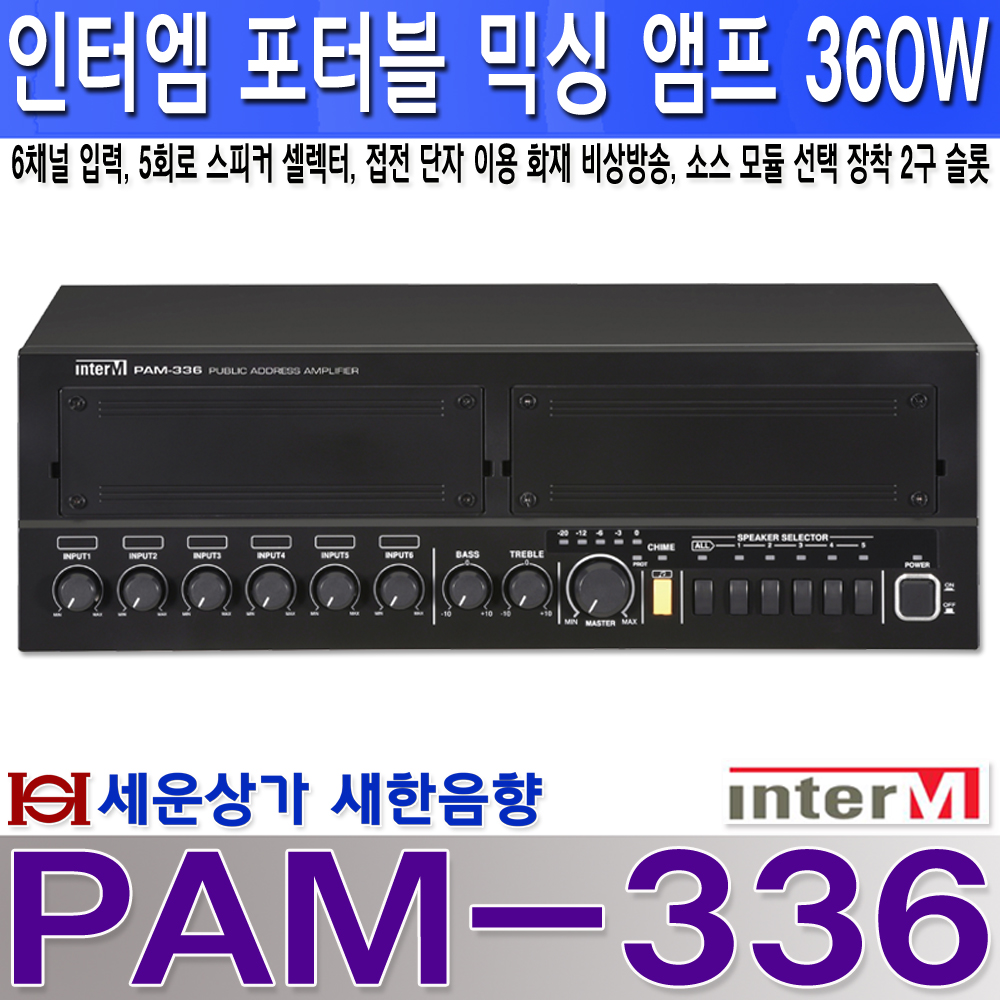 PAM-336 인터엠 360W 앰프, 5회로 셀렉터, 화재 비상 방송 음성 내장, 팬텀파워, 소스 모듈 선택 장착 기능, PAM336