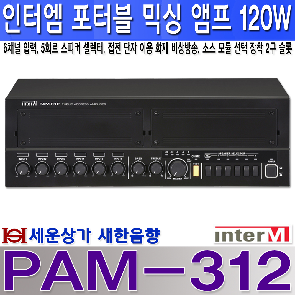 PAM-312 인터엠 120W 앰프, 5회로 셀렉터, 화재 비상 방송 음성 내장, 팬텀파워, 소스 모듈 선택 장착 기능, PAM312