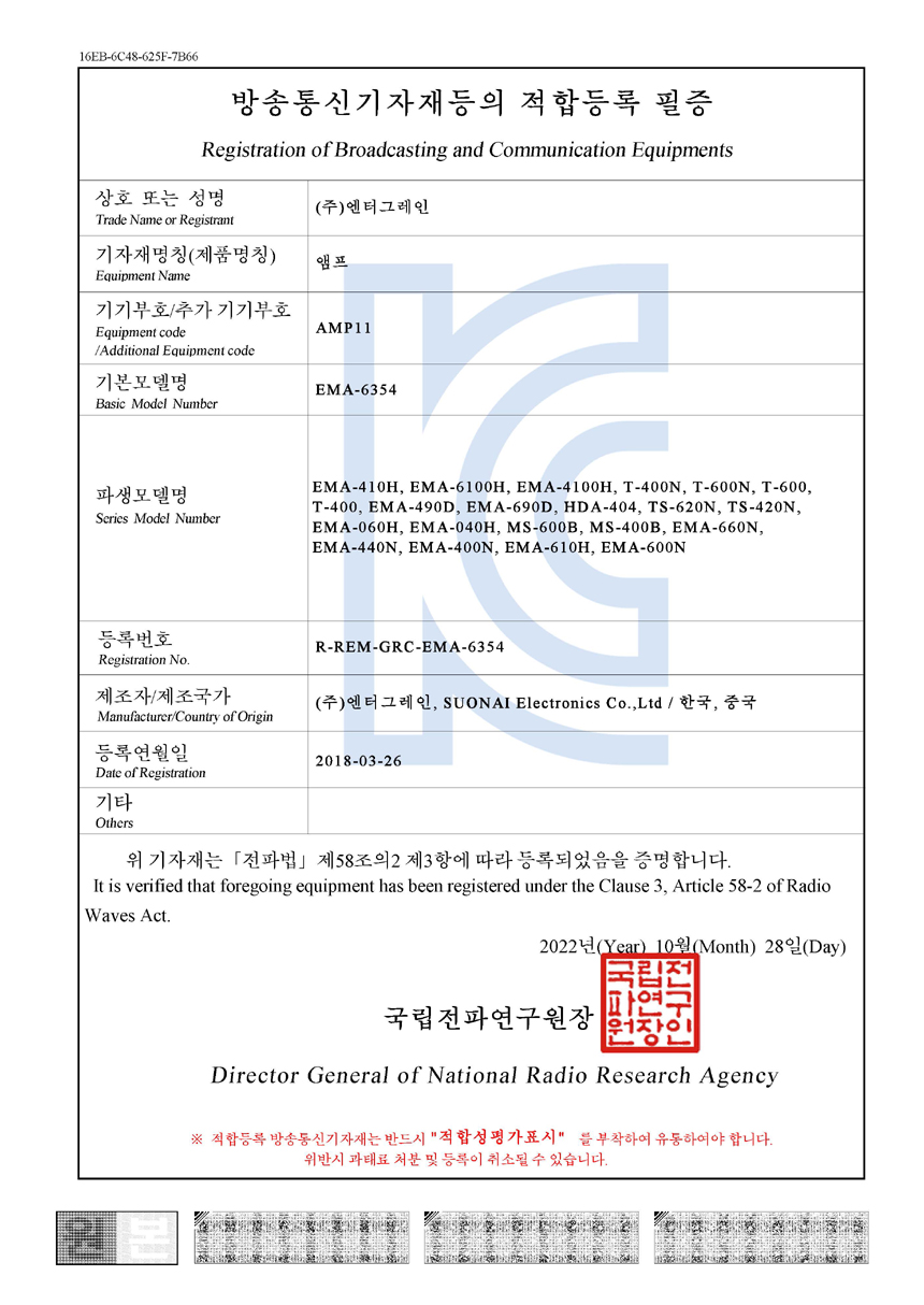 - 방송 통신 기자재 적합 인증 : R-REM-GRC-EMA-6354, S18KR-044