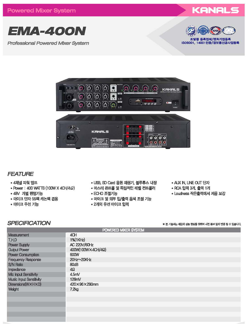 EMA-400N 카날스 4채널 앰프 400W, USB, SD, 블루투스, 마이크 뮤트, 채널 별 음량 조절, 마이크 팬텀 파워 / EMA400N