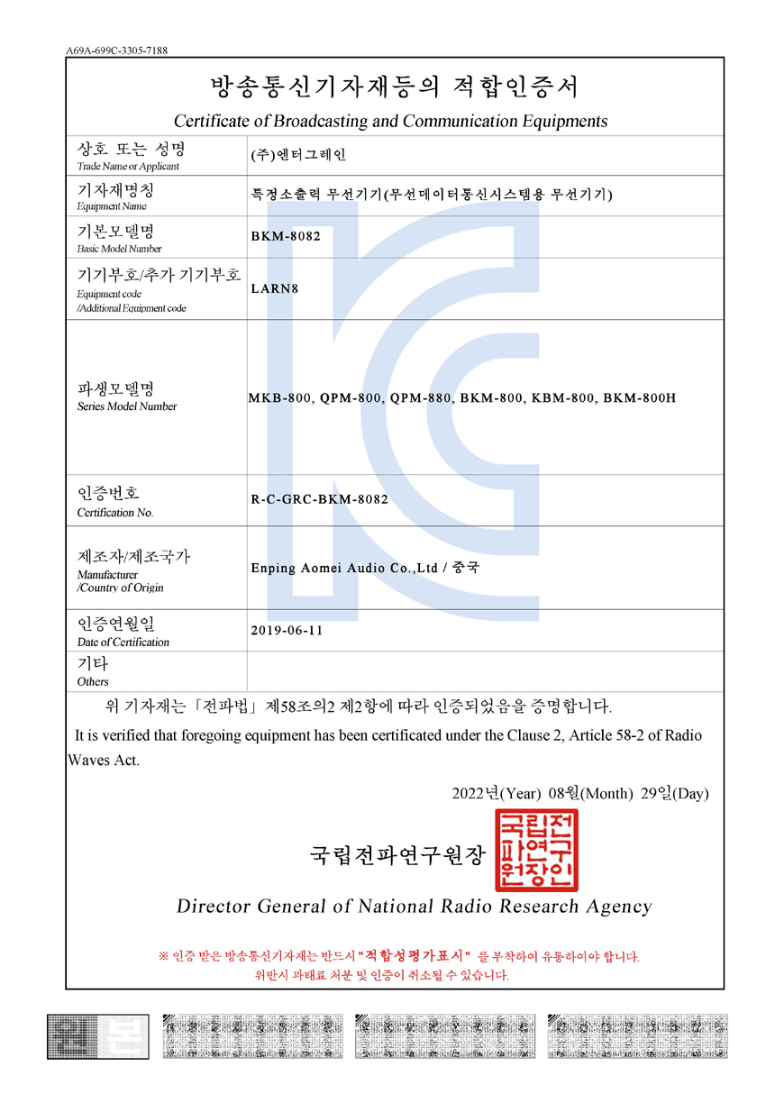 - 방송 통신 기자재 적합 인증 : R-R-GRC-BKM-8082