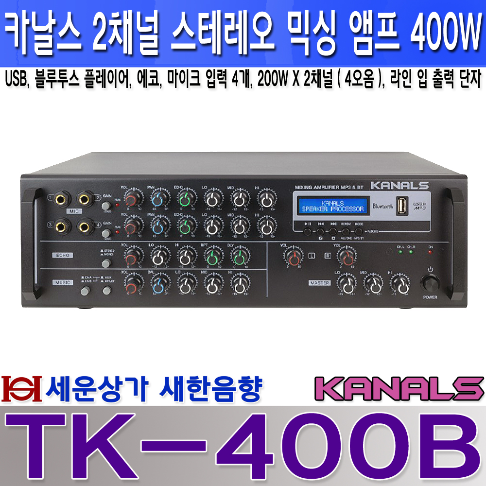 TK-400B 카날스 2채널 스테레오 앰프 400W, USB 블루투스, 마이크 입력 4개 : 새한음향 세운상가