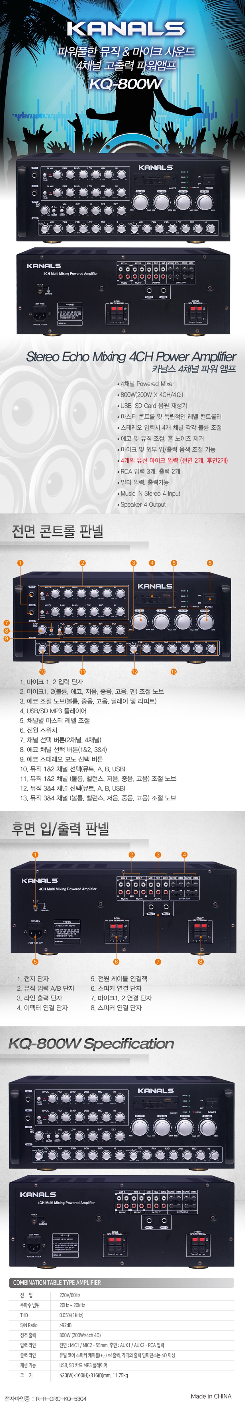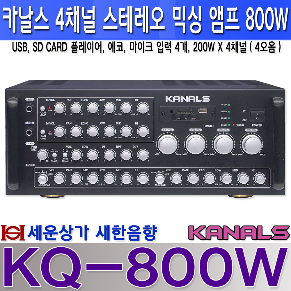 KQ-800W카날스 4채널 앰프 800W, USB, SD, 에코, 채널별 개별 음량 조절 : 새한음향 세운상가