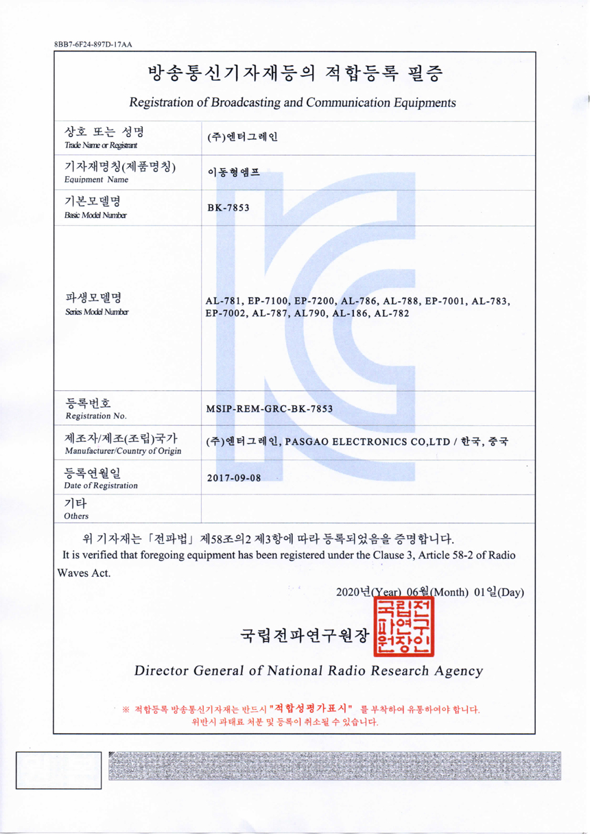 - 방송 통신 지자재 적합 인증 번호 :