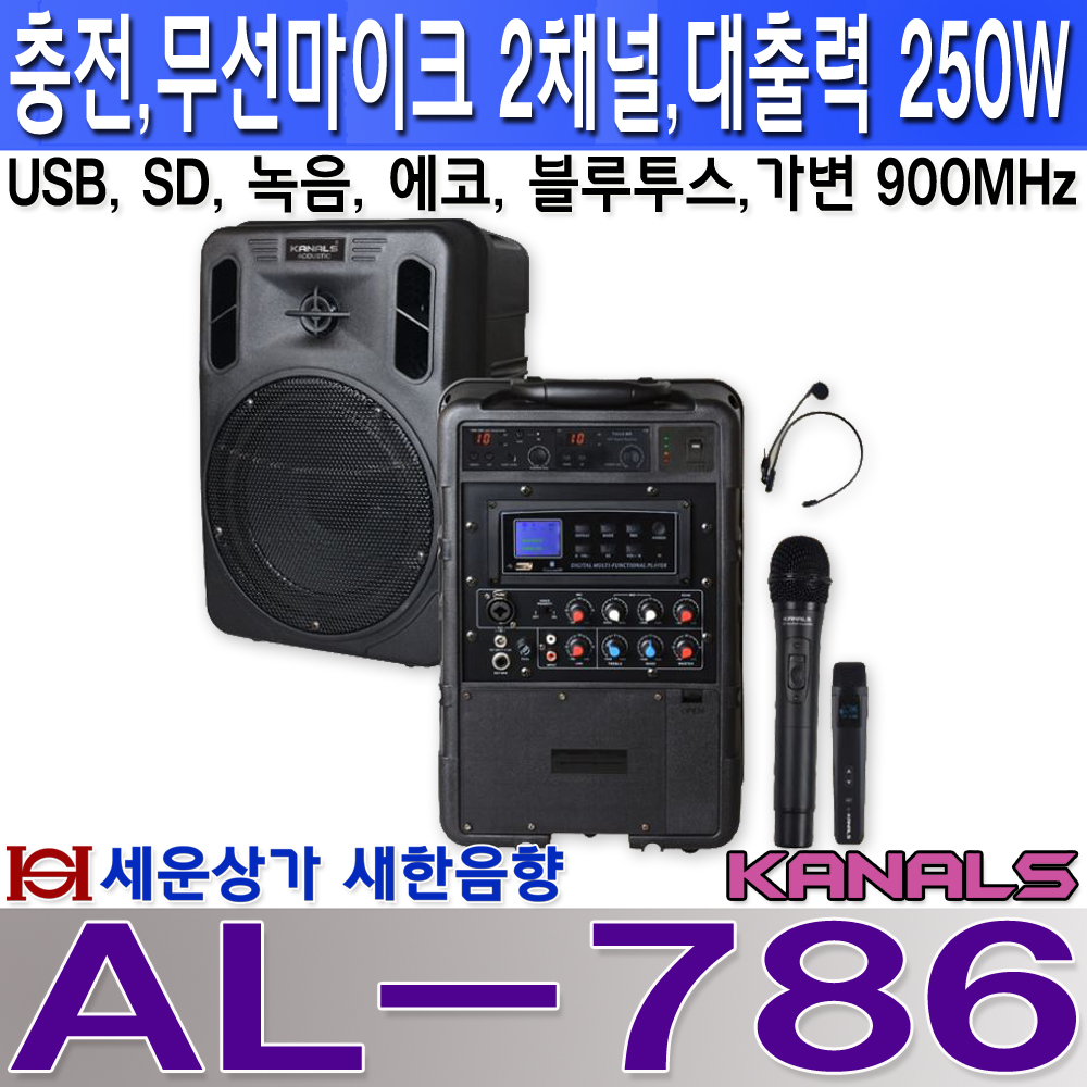 AL-786카날스 충전식 앰프 250W, 2채널 무선 마이크,블루투스, USB,에코 녹음 : 새한음향 세운상가