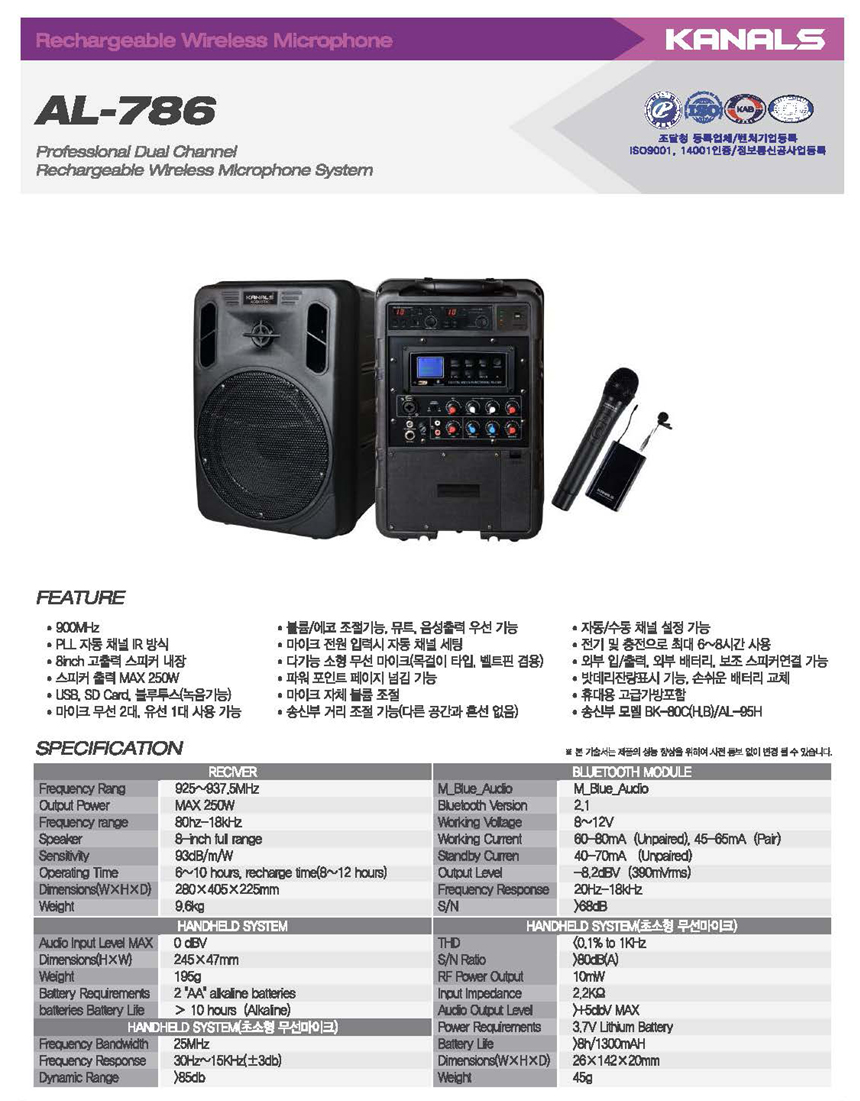 - 품 명 : 카날스 충전 이동식 앰프 250W / AL786