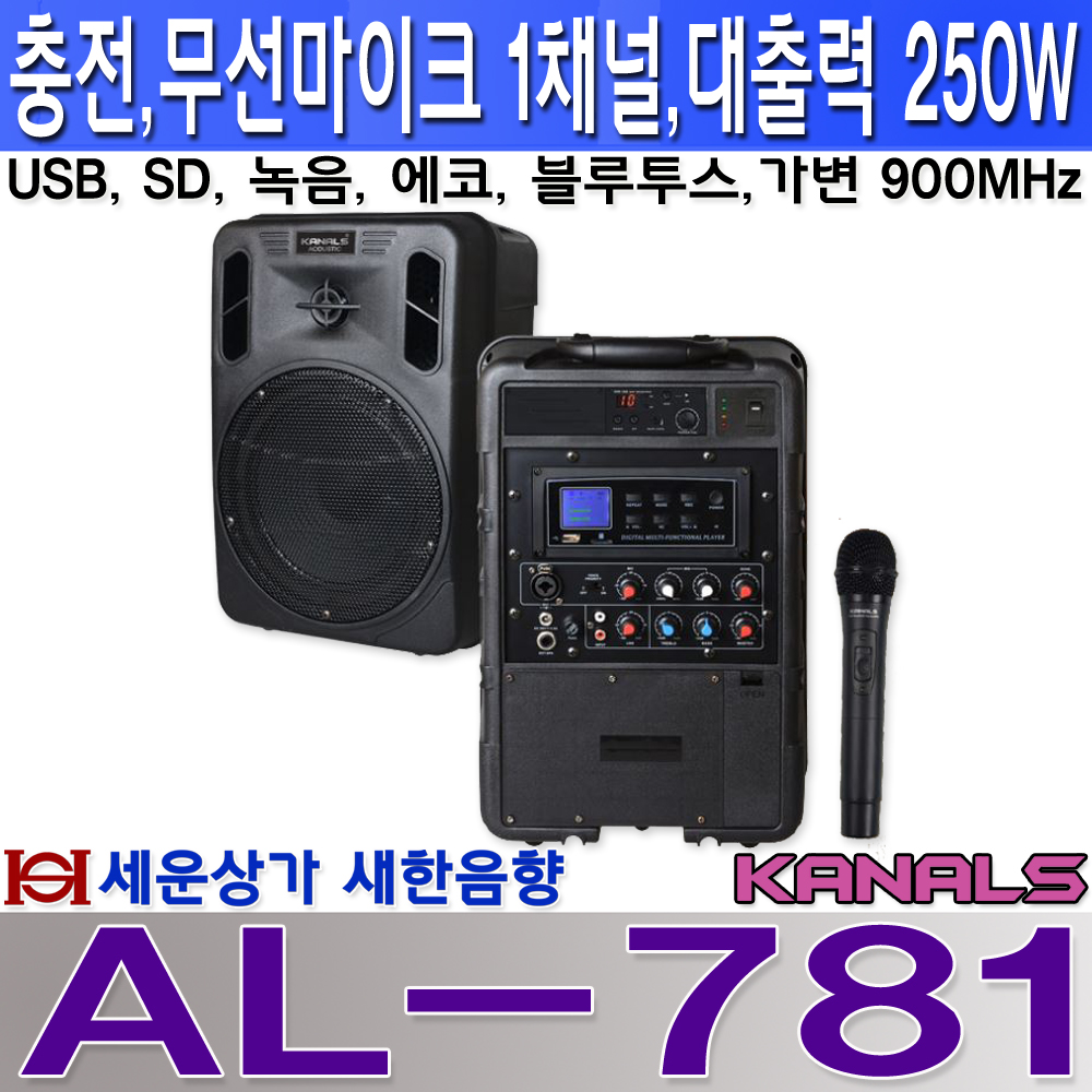 AL-781카날스 충전식 앰프 250W, 1채널 무선 마이크,블루투스, USB,녹음 에코 : 새한음향 세운상가