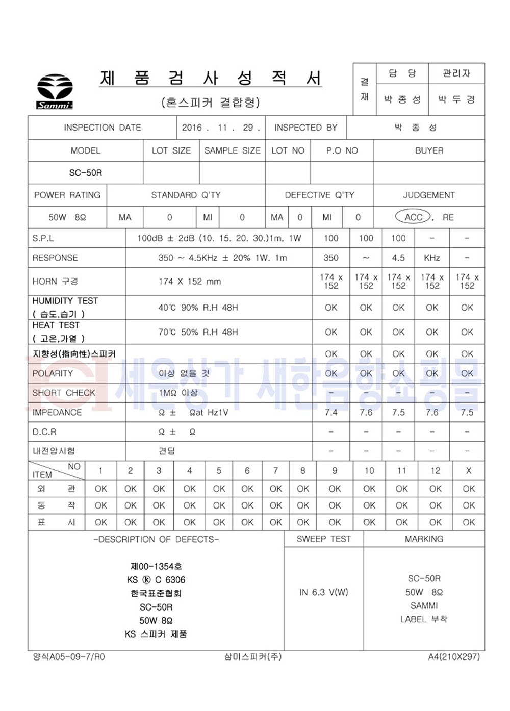 KS C 6306 8오옴 PA방송용 삼미스피커 SC50R