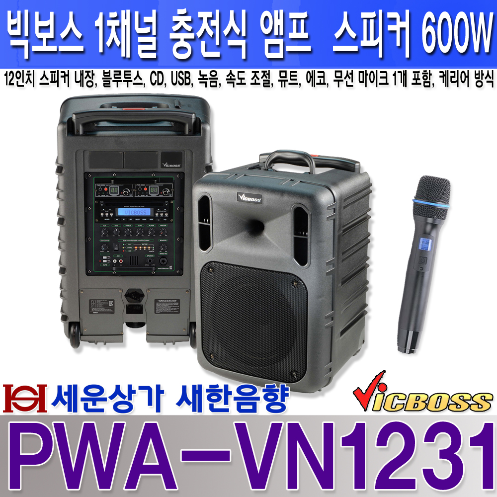 PWA-VN1231 빅보스 충전식 앰프 600W, 블루투스, CD, USB, SD, 녹음, 에코, 1채널 무선 마이크 / PWAVN1231