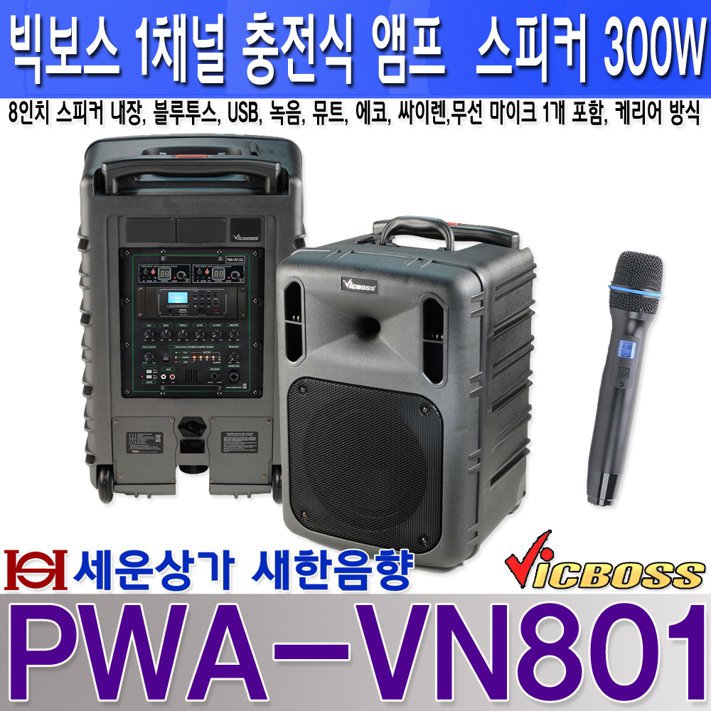 PWA-VN801 빅보스 충전식 앰프 300W, 블루투스, USB, SD, 녹음, 에코, 싸이렌, 1채널 무선 마이크 / PWAVN801